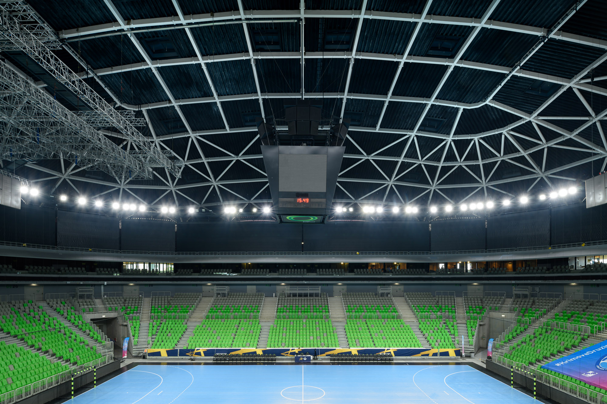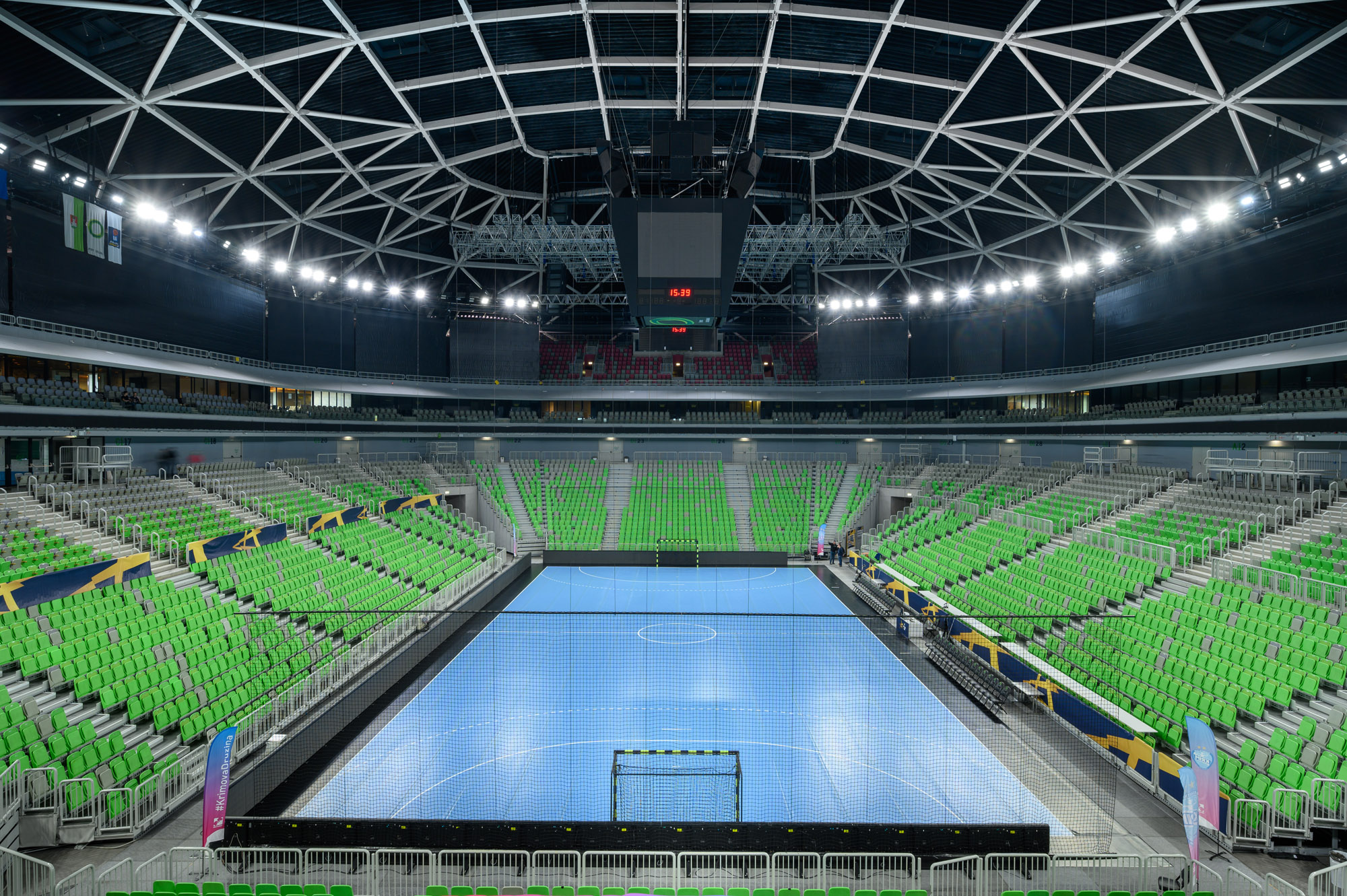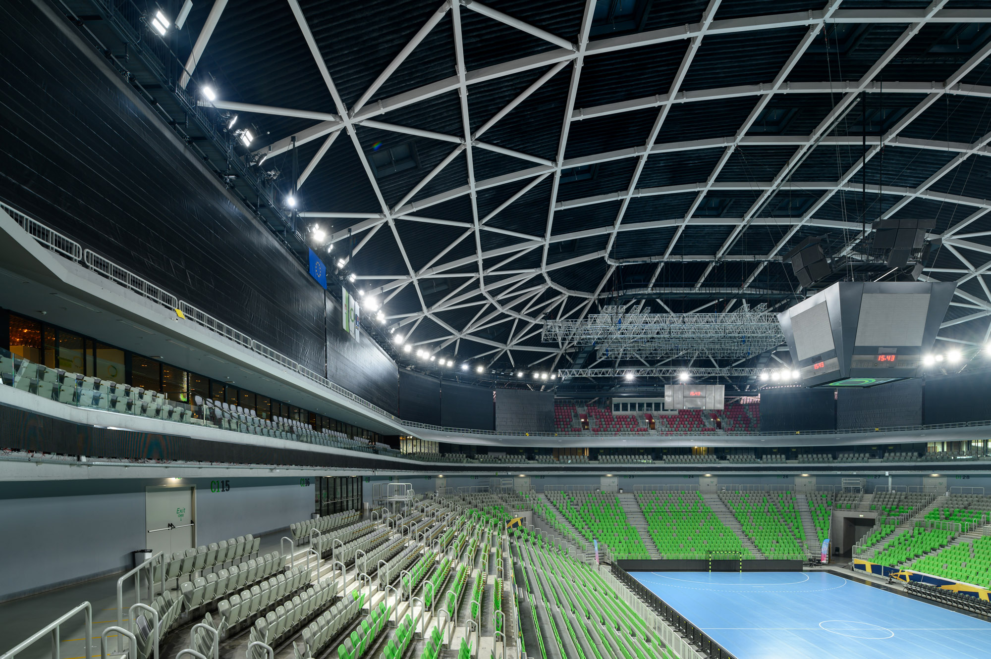 The building is designed in a modular format with floor plan dimensions of 127x161 m. The central part of the facility is a playground at an angle of -4.50, surrounded by stands with seats. The roof of the hall is designed as a large-span light steel shell structure. The hall is designed for 14,000 spectators.